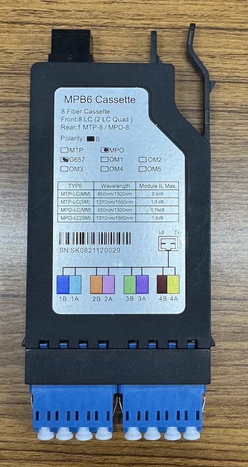 カセットには色々な種類があり、今回使用したMPOからLCに分岐するもの以外に、光を分岐する物もあります。これはPONの分岐や測定用の分岐に使われます。